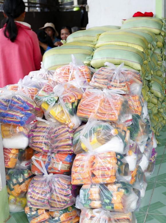Khá đông người dân xếp hàng và chờ nhận các phần quà hỗ trợ từ Hoa hậu Dương Kim Ánh.