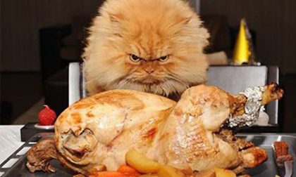 Chú mèo xù lông, cáu kỉnh trước bàn tiệc thịnh soạn.