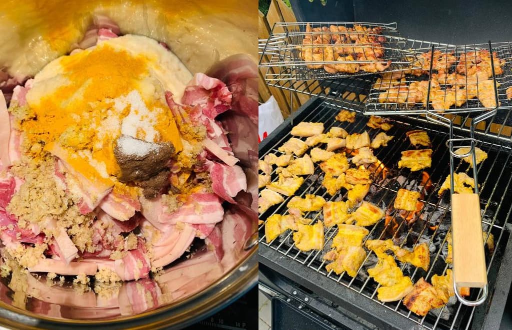 Ướp thịt ba chỉ với mẻ và mắm tôm, riềng, sau đó nướng lên sẽ tạo ra một món ăn thơm ngon, hấp dẫn.