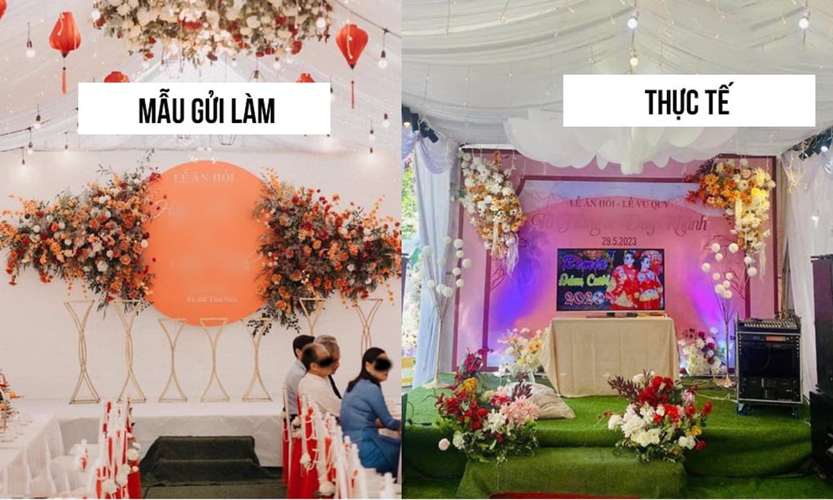 Hình ảnh mẫu rạp cưới khác hoàn toàn so với thực tế khi thi công khiến cô dâu bức xúc.