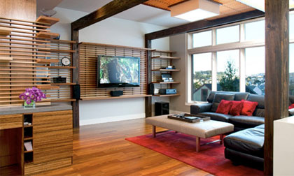 TV treo tường trông rất đẹp khi kết hợp với kệ mở bởi vì chúng tạo ra sự tương phản vừa phải.
