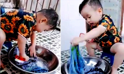 Bé trai 3 tuổi tự tay giặt quần áo như người lớn khiến dân mạng thích thú