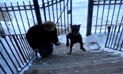 Chú chó có khả năng giữ thăng bằng trên 2 chân và từng bước leo lên cầu thang.