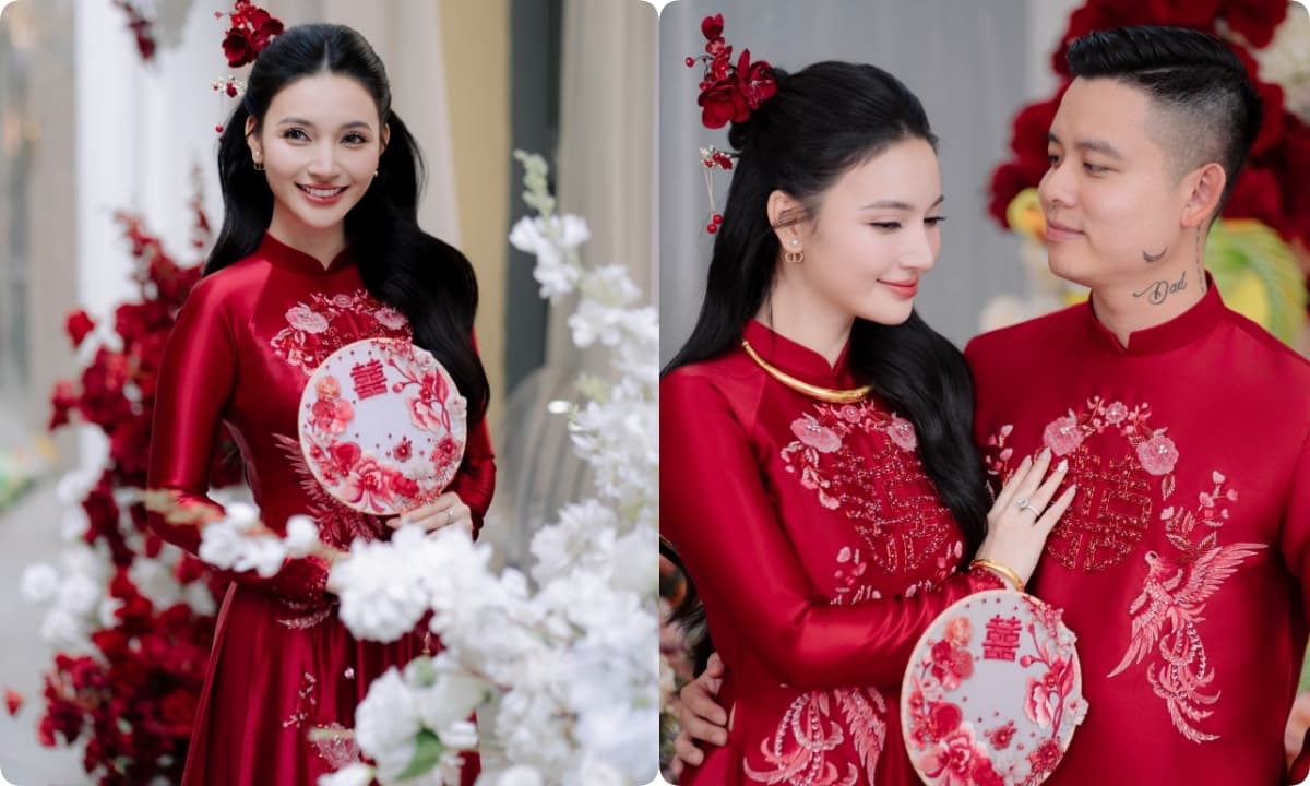 Bích Thủy diện áo dài kiêu sa khoe sắc bên chồng trong lễ ăn hỏi.