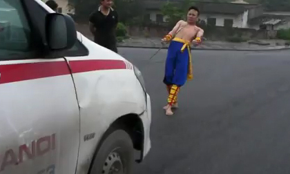 Rùng mình xem chàng trai đóng kim xuyên qua da rồi kéo ô tô