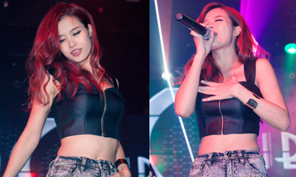 Trình diễn trong chương trình diễn ra tại một quán bar ở TP.HCM vào tối 20/6, nữ ca sĩ để lộ vòng eo không hoàn...
