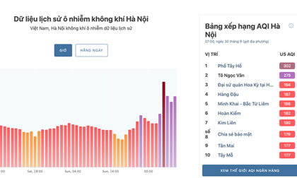Sáng nay (30.9), nhiều khu vực ở Hà Nội có mức chỉ số chất lượng không khí AQI chuyển sang màu tím và nâu -...
