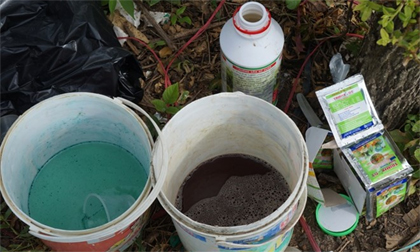 Đang thu hoạch nhưng đầu bờ ruộng đã để sẵn hai thùng thuốc tăng trưởng cây trồng đã được pha chế sẵn để “tắm” cho...
