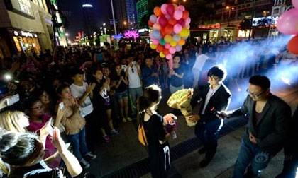 Màn cầu hôn hoành tráng trước cửa một trung tâm mua sắm khiến nhiều người ghen tị với cô gái may mắn.
