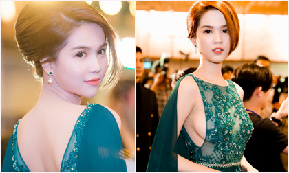 Ngọc Trinh khoe vòng một sexy và để tự nhiên trong bộ đầm ren xanh mang phom dáng áo choàng trên thảm đỏ sự kiện...