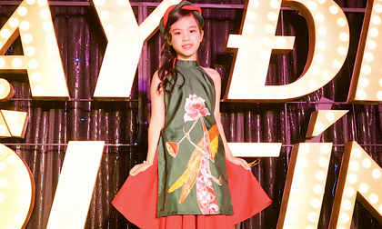 Siêu mẫu nhí Ngọc Anh trong trang phục áo dài cách tân của nhà thiết kế Phương Nguyễn Silk đến tham dự sự kiện ra...