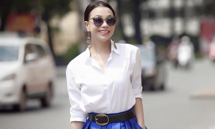 (Ngoisao.vn) - Với chiếc áo sơ mi trắng cùng chân váy xanh, Trà Ngọc Hằng trông như một cô nữ sinh trẻ trung, năng động...