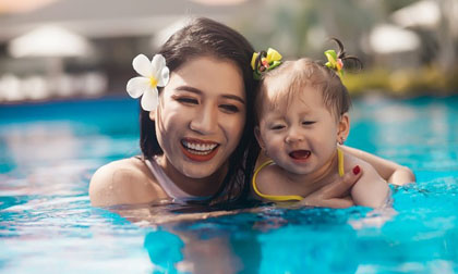 Hai mẹ con Trang Trần xinh đẹp vui đùa ở bể bơi