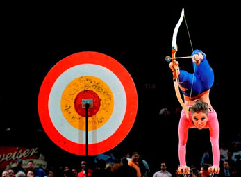 Nghệ sĩ uốn dẻo Nga trổ tài bắn cung bằng chân